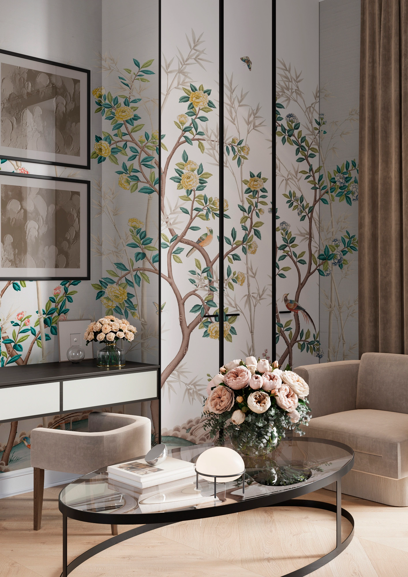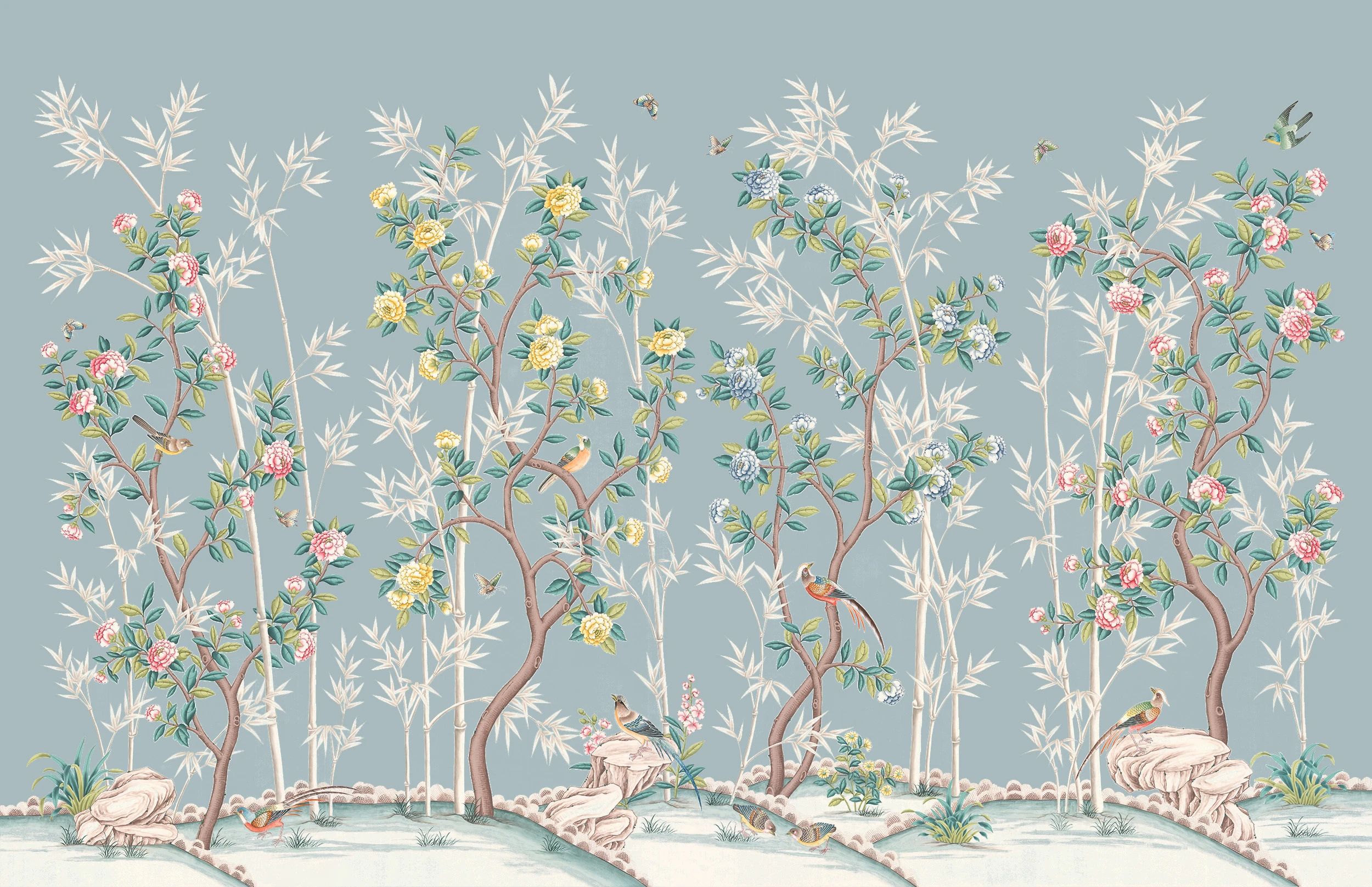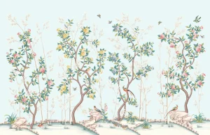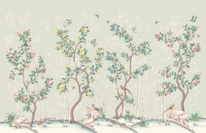 The Chinoiserie wallcoverings collection features images of birds, plants, and animals, creating an atmosphere of Eastern elegance and refinement. This style uses delicate patterns and motifs inspired by traditional Chinese art. The color palette often includes rich and vibrant tones that highlight the sophistication of the design. The collection is perfect for those who want to bring a touch of Eastern culture and natural beauty into their interior.