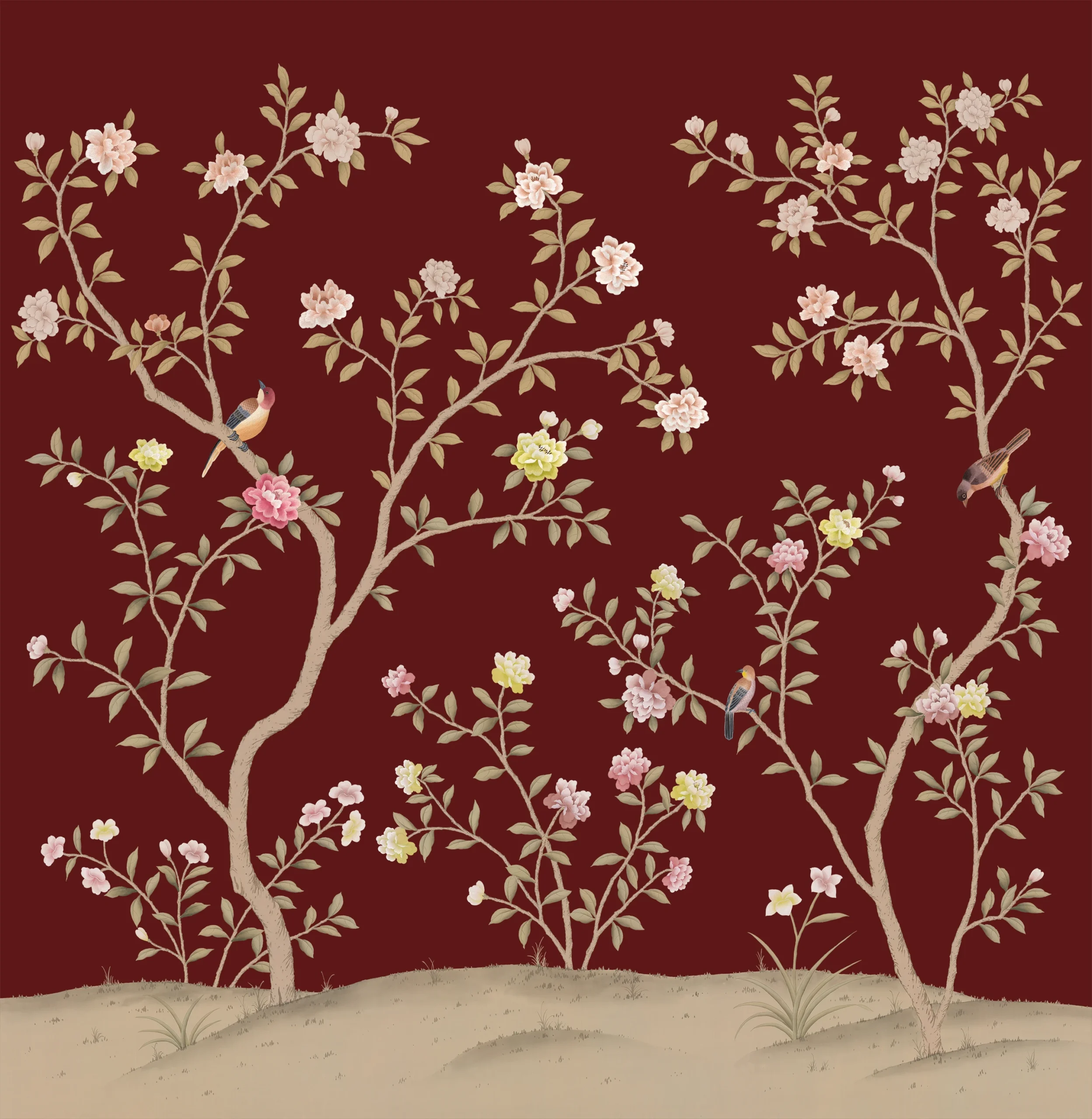 The Chinoiserie wallcoverings collection features images of birds, plants, and animals, creating an atmosphere of Eastern elegance and refinement. This style uses delicate patterns and motifs inspired by traditional Chinese art. The color palette often includes rich and vibrant tones that highlight the sophistication of the design. The collection is perfect for those who want to bring a touch of Eastern culture and natural beauty into their interior.